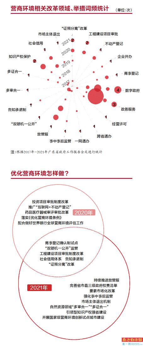 “深化重点领域改革,加快构建市场化法治化国际化营商环境,更好激发市场发展活力……”1月24日,2021年广东省政府工作报告(下称报告)出炉,5次提及营商环境,明确提出一系列优化营商环境、激发市场主体活力的政策方向。广东省近年营商环境优化成效明显,这五年来工作侧重点有何变化?政府工作报告提示了营商环境哪些改革区域?南都大数据研究院对2017年-2021年广东省政府工作报告进行文本分析,解读营商环境建设工作重心,并展望2021年营商环境新变革。