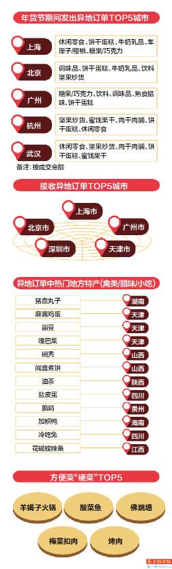另一方面,今年年货节,部分城市发出的异地订单量骤增。京东平台数据显示,发出异地订单增幅靠前的城市分别是大连、武汉、成都、广州、深圳,增幅均超过50%,最高达219%。