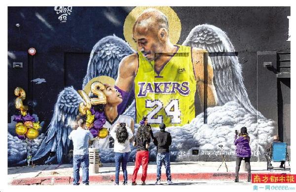 美国球迷在直升机坠毁事故地点、“科比壁画”前悼念科比。