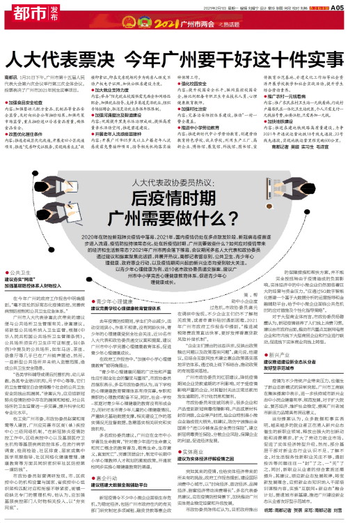 2021广州市两会之热话题南都讯 1月31日下午,广州市第十五届人民代表大会第六次会议举行第三次全体会议,投票表决了广州市2021年民生实事项目。 加强食品安全检查内容:加强婴幼儿配方食品、乳制品等食