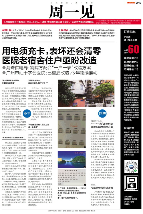 本期上榜:近日,广州市红十字会医院宿舍的业主何先生反映,医院宿舍上世纪90年代建成,住户多年来需要到医院充卡才能用电,且电表一坏此前充值即归零。此外,住户担忧疫情期间经常进出医院充值有风险。上榜理由: