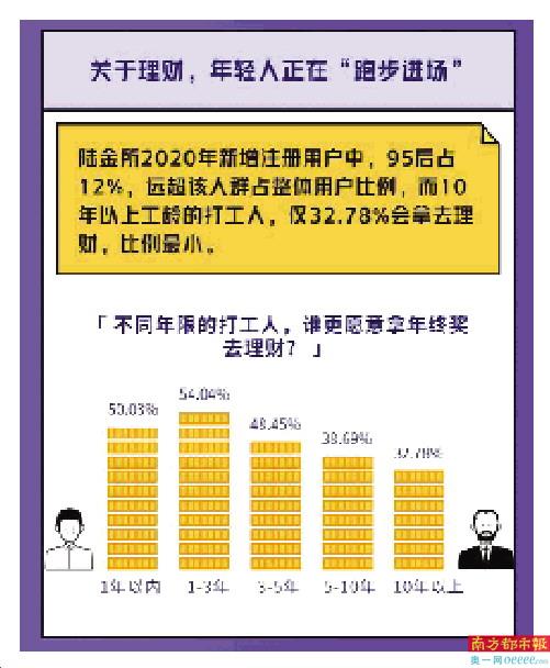 接近年关,“年终奖”和“基金投资”可能是关于打工人钱袋子的两个最热门话题,轮番登上微博热搜榜单。近期,陆金所联合脉脉进行的一项“职场人年终奖真相调研”数据显示,超四成打工人选择用年终奖理财,而全民“养基”热潮下,95后“基民”正跑步入场。有意思的是,用户年末理财情绪空前高涨,陆金所平台数据显示,2020年11-12月用户平均每月在线时长相比1-10月平均值,陡增了近50%。