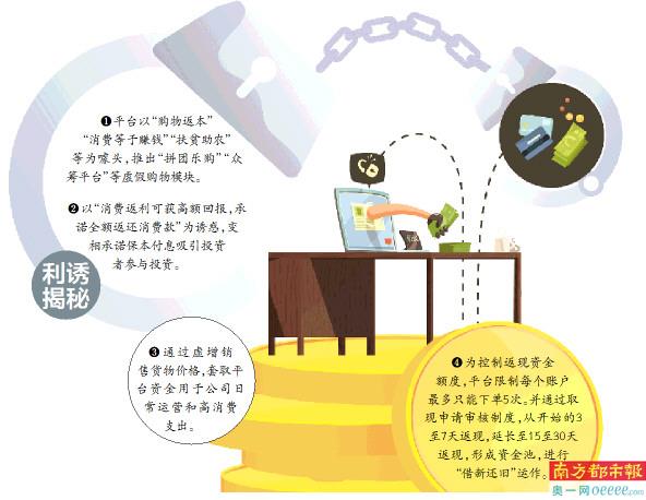 经天河警方查实,“易网购平台”由新动力公司运营,该公司先后在珠江新城某广场等地办公。瞿某等人筹谋拍摄融资上市中英文宣传片、庆功小视频,通过网络大肆宣传“易网购平台”的“高额回报”。实际上,平台以“购物返本”“消费等于赚钱”“精准扶贫、扶贫助农、帮助农户解决滞销问题”等为噱头,推出“拼团乐购”“众筹平台”等虚假购物模块;以“消费返利可获高额回报,承诺全额返还消费款”“平台购物2-30天内可获10%的收益”为诱惑,变相承诺保本付息吸引投资者参与投资。