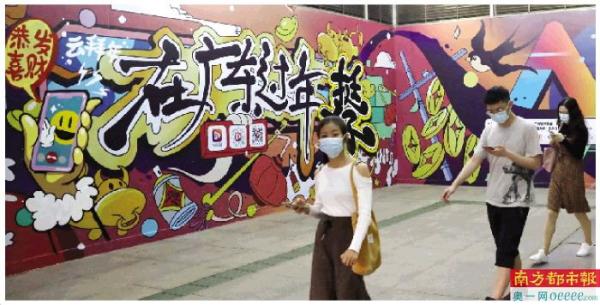 昨日,南都记者在广州杨箕地铁站F口看到,地铁站也换上了“新装”。不少步履匆匆的市民在入站时,被数面大型艺术墙吸引,驻足观看。艺术墙上,孩童掩耳点鞭炮,卡通“牛仔”穿着喜庆的中式服装拜年,报春鸟衔来串串铜钱,人们手捧年花奔向“梦想站”……这正是人们熟知的传统“广式新年”的生活场景和意象。