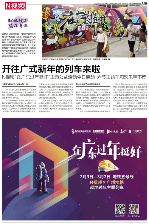 南都讯 记者柯晓明 “叮咚!”你的N视频“过年氛围组”已上线!2月3日上午,N视频“在广东过年挺好”主题公益活动将启动,为留粤过年的人们带来一系列丰富的活动和精彩的视觉享受。设计时尚潮流的广州地铁5号