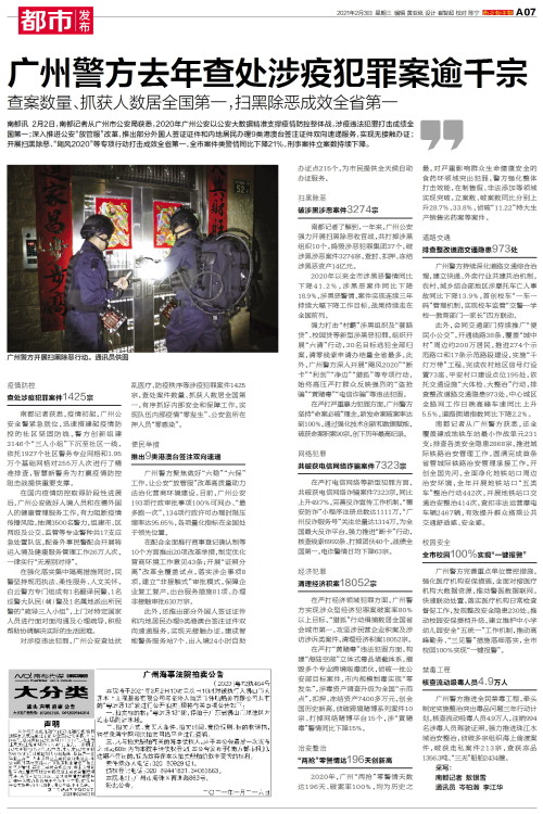 南都讯 2月2日,南都记者从广州市公安局获悉,2020年广州公安以公安大数据精准支撑疫情防控整体战,涉疫违法犯罪打击成绩全国第一;深入推进公安“放管服”改革,推出部分外国人签证证件和内地居民办理9类港