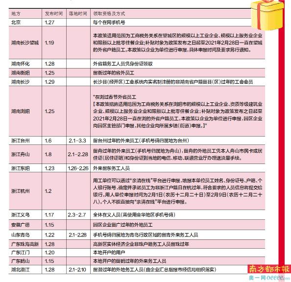 话费、通话时间或者其他优惠则相对较少,除了上述的湖南长沙县外,安徽广德市表示赠送200分钟通话给园区企业留广过年的外地员工。与此类似的山东青岛三大运营商也表示,手机号码归属地为青岛行政区域的留青外来务工人员,都可以获赠200分钟国内通话时长。此外还有运营商赠送免费宽带提速和购机优惠等。