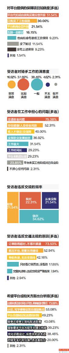 除了上述两点,还有49.23%的受访骑手希望平台合理制定配送路线和时限;43.08%提出限制骑手单次接单上限和配送距离,降低配送压力;39.23%希望政府部门强制要求平台为全体骑手办理工伤保险;38.46%希望交通部门优化道路设计,拓宽非机动车道,减少交通事故发生。