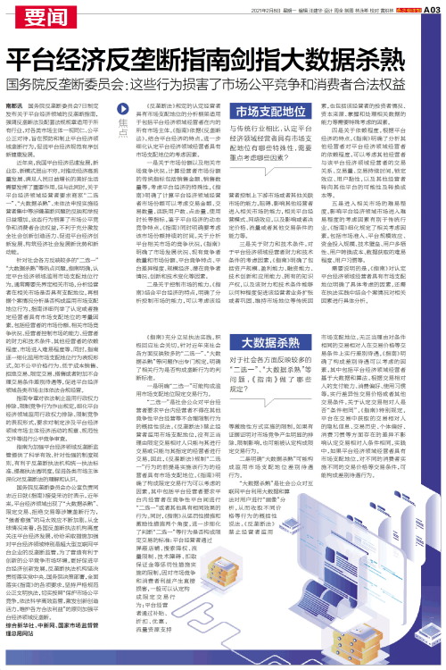 南都讯 国务院反垄断委员会7日制定发布关于平台经济领域的反垄断指南,强调反垄断法及配套法规规章适用于所有行业,对各类市场主体一视同仁、公平公正对待,旨在预防和制止平台经济领域垄断行为,促进平台经济规范