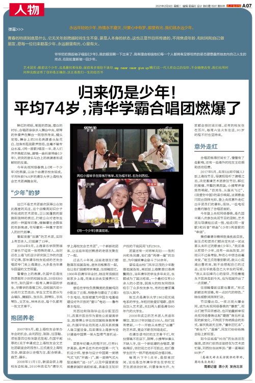今年央视网络春晚上《同一个少年》的表演,让这个由清华校友组成,平均年龄74.5岁的清华大学上海校友会艺术团沸腾全网。