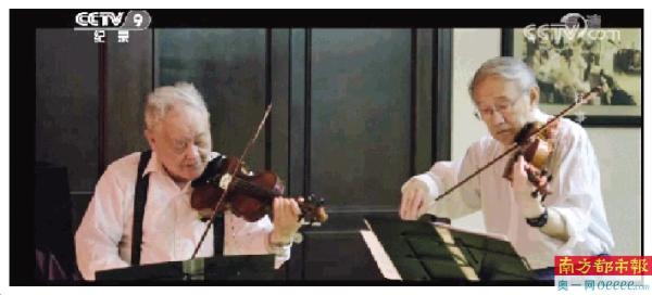 两位小提琴手在排练厅练琴。左为程不时,右为刘西拉。