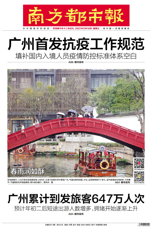 霏霏细雨中,人们打着伞游览荔枝湾。2月9日,久违了的雨水终于降临广州,气温也有所回落。不过,这场雨持续不了多久,省气象局发布消息称,今年春节,气温相较往年明显偏高,降水量也偏少。 吴伟洪 摄 A04