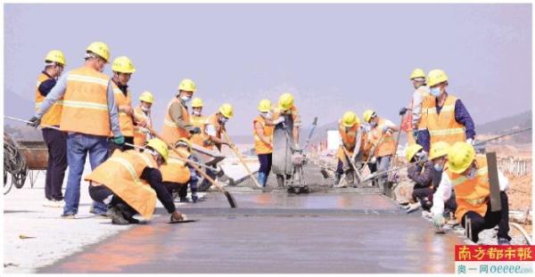 韶关机场工程现场,工人们正在进行飞行区道面施工。