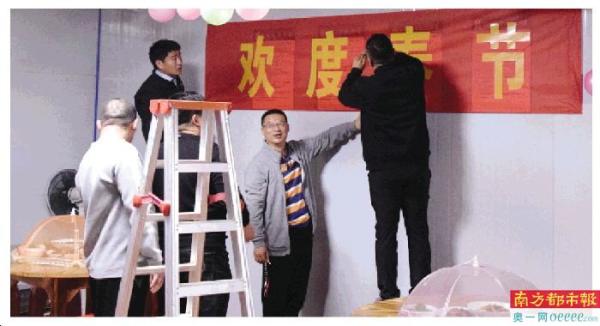 韶关机场建设工程工地,工友们挂灯笼布置活动现场。