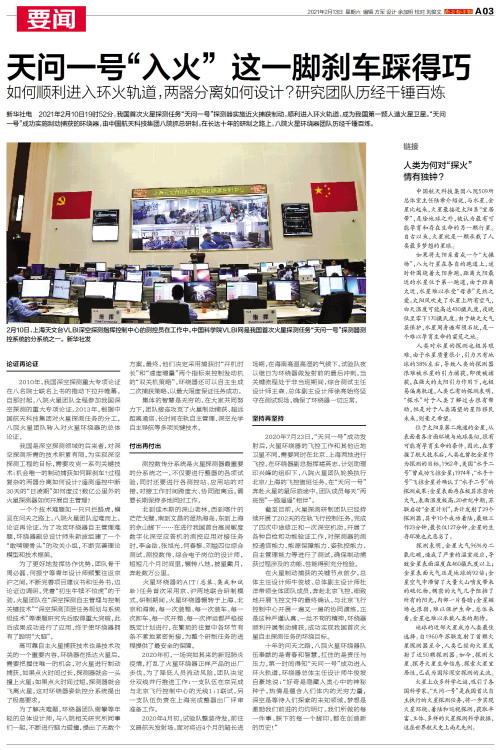 新华社电 2021年2月10日19时52分,我国首次火星探测任务“天问一号”探测器实施近火捕获制动,顺利进入环火轨道,成为我国第一颗人造火星卫星。“天问一号”成功实施制动捕获的环绕器,由中国航天科技集