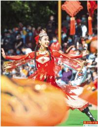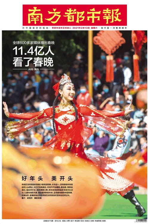 市民在深圳民俗村观看少数民族歌舞。大年初一,深圳锦绣中华民俗村人头攒动,大红灯笼高高挂,村村户户贴春联。看杂耍、观民俗演出、逛自贡灯会、跳风情篝火舞、吃年味美食等诸多传统文化活动,以最传统的元素,营造