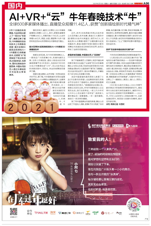 2月11日晚的央视春晚,为全球观众献上了一场文化“年夜饭”。南都记者了解到,牛年春晚在创意和技术上均有新的突破:首次采用8K超高清视频和AI+VR裸眼3D演播室技术,还使用“云”视频架起了观众和演员之