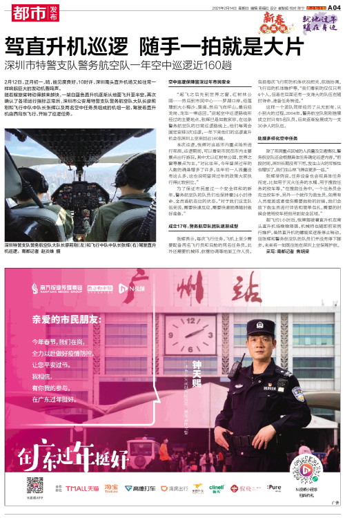 2月12日,正月初一,晴,能见度良好。10时许,深圳南头直升机场又如往常一样响起巨大的发动机轰鸣声。随着螺旋桨转动得越来越快,一架白蓝色直升机逐渐从地面飞升至半空。再次确认了各项运行指标正常后,深圳市