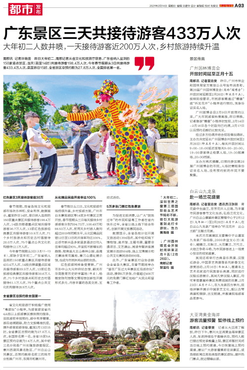 南都讯 记者许晓蕾 昨日大年初二,南都记者从省文化和旅游厅获悉,广东省纳入监测的150家重点景区,当天(截至14时)共接待游客198.4万人次,今年春节假期头3日共接待游客433.4万人次。截至昨日1