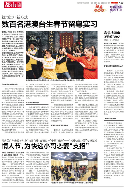 南都讯 记者叶孜文 实习生李春昊 通讯员庄煜 杨嘉琪 昨日,共青团广州市委联合市邮政管理局、市快递行业协会在市青年宫举办“花城有爱·在穗过年”春节“暖蜂”——“关爱快递小哥”专场活动,组织30名在穗过