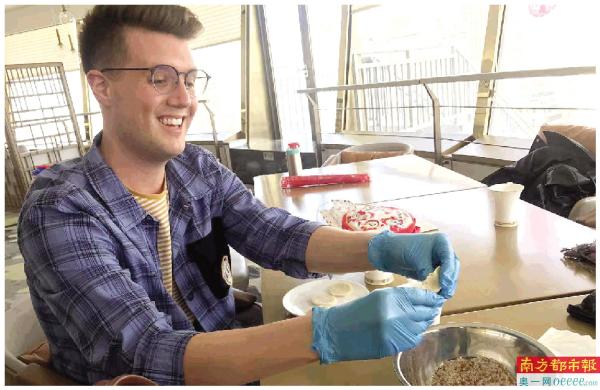 1月30日,“体验岭南食俗”的活动现场,记者采访了该活动的导游曹万龙,江湖人称“龙哥”。在岭南过年,以前家家户户都要“炸”油角、蛋散等小吃,这是一种“年宵”小吃,正是岭南过年的食俗。开场之前,龙哥先向外国朋友普及了“中国年”的由来,“开工”状态中的龙哥精神抖擞,他说:英语国家是give me five,手掌张开,而岭南文化中是讲究左手五指握拳、右手五指并拢抱拳,这个恭祝新禧的手势,实际上有“福禄寿仁德”的含义,龙哥还领着大家用粤语互道“恭喜发财”,并向大家送出过年“利是”。