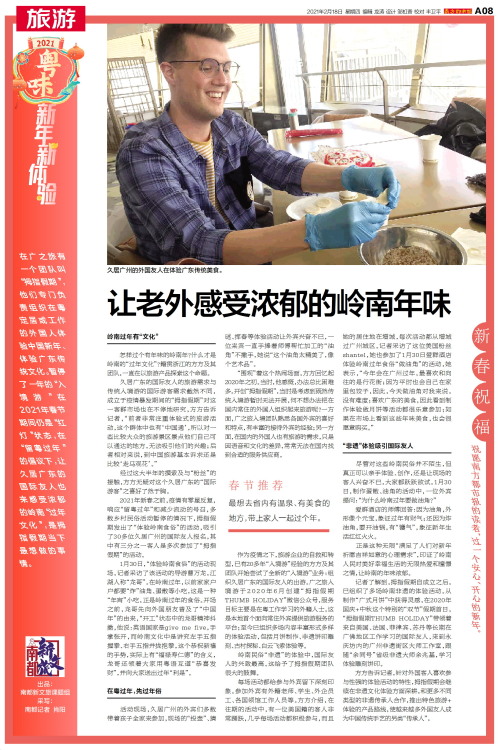 新春祝福祝愿南方都市报的读者,过一个安心、开心的新年。在广之旅有一个团队叫“拇指假期”,他们专门负责组织在粤定居或工作的外国人体验中国新年、体验广东传统文化。暂停了一年的“入境游”在2021年春节