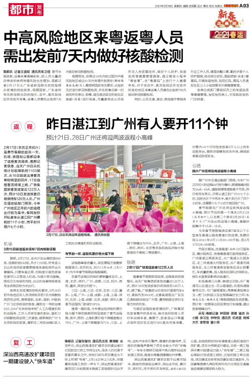 南都讯 记者王道斌 通讯员粤卫信 春节长假结束,返粤来粤高峰到来,因人员大量流动带来的疾病传播风险也在增加。南都记者2月17日从广东省新冠肺炎防控指挥办疫情防控组获悉,根据国家、广东省的有关新冠肺炎防