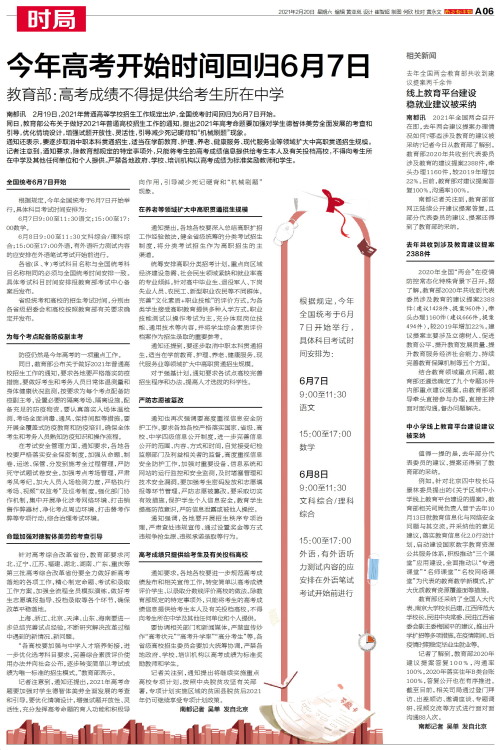 南都讯 2月19日,2021年普通高等学校招生工作规定出炉,全国统考时间回归为6月7日开始。同日,教育部公布关于做好2021年普通高校招生工作的通知,提出2021年高考命题要加强对学生德智体美劳全面发