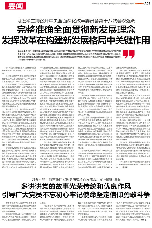 中共中央总书记、国家主席、中央军委主席、中央全面深化改革委员会主任习近平2月19日下午主持召开中央全面深化改革委员会第十八次会议并发表重要讲话。他强调,全面深化改革同贯彻新发展理念、构建新发展格局紧密