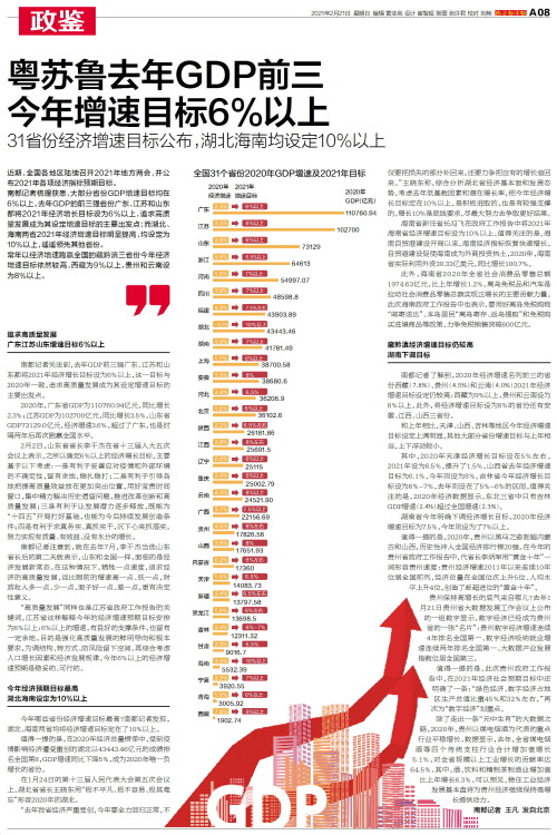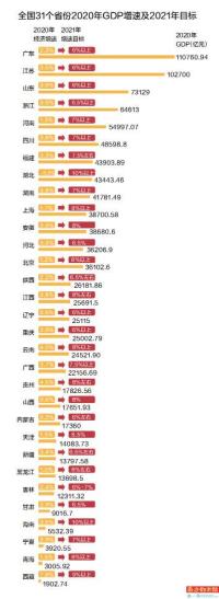 近期,全国各地区陆续召开2021年地方两会,并公布2021年各项经济指标预期目标。南都记者梳理获悉,大部分省份GDP增速目标均在6%以上。去年GDP的前三强省份广东、江苏和山东都将2021年经济增长目