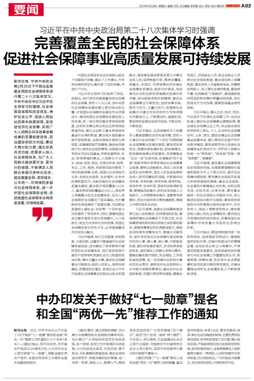 新华社电 中共中央政治局2月26日下午就完善覆盖全民的社会保障体系进行第二十八次集体学习。中共中央总书记习近平在主持学习时强调,社会保障是保障和改善民生、维护社会公平、增进人民福祉的基本制度保障,是促