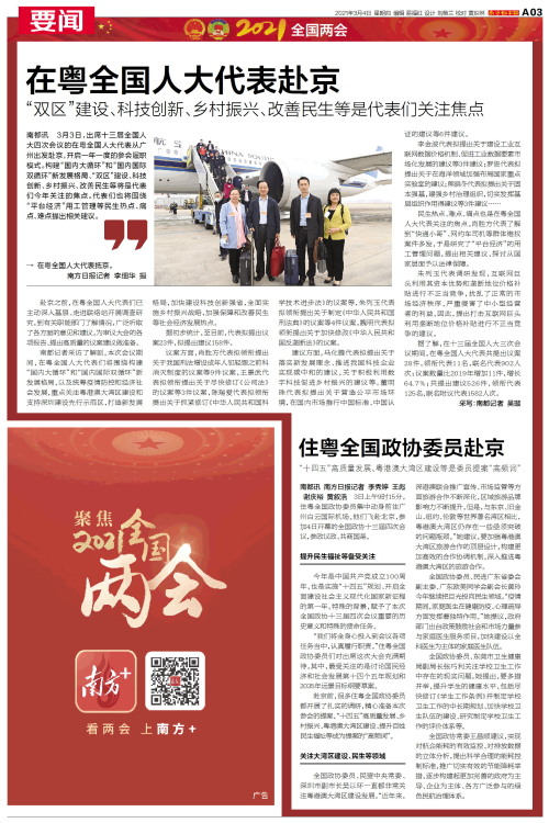 南都讯 3月3日,出席十三届全国人大四次会议的在粤全国人大代表从广州出发赴京,开启一年一度的参会履职模式。构建“国内大循环”和“国内国际双循环”新发展格局、“双区”建设、科技创新、乡村振兴、改善民生等