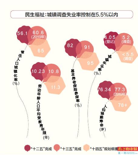 对于普通民众最为关注的民生领域,“十四五”规划纲要草案中提出要让民生福祉达到新水平。南都大数据研究院对比“十三五”和“十二五”时期数据发现,基本养老保险参保率、城镇调查失业率和人均预期寿命等均超过预期水平。