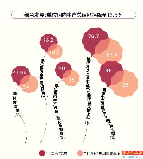 生态文明建设实现新进步也是“十四五”时期经济社会发展的主要目标之一。“十四五”规划纲要草案提出,要使国土空间开发保护格局得到优化,生产生活方式绿色转型成效显著,能源资源配置更加合理、利用效率大幅提高,单位国内生产总值能源消耗和二氧化碳排放分别降低13.5%、18%,主要污染物排放总量持续减少,森林覆盖率提高到24.1%,生态环境持续改善,生态安全屏障更加牢固,城乡人居环境明显改善。