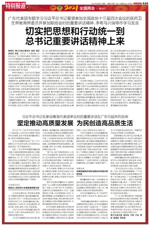 3月7日下午,习近平总书记在参加十三届全国人大四次会议青海代表团审议时强调,坚定不移走高质量发展之路,坚定不移增进民生福祉。总书记的重要讲话在广东广大干部群众中产生热烈反响,也引发参加全国两会的广东代