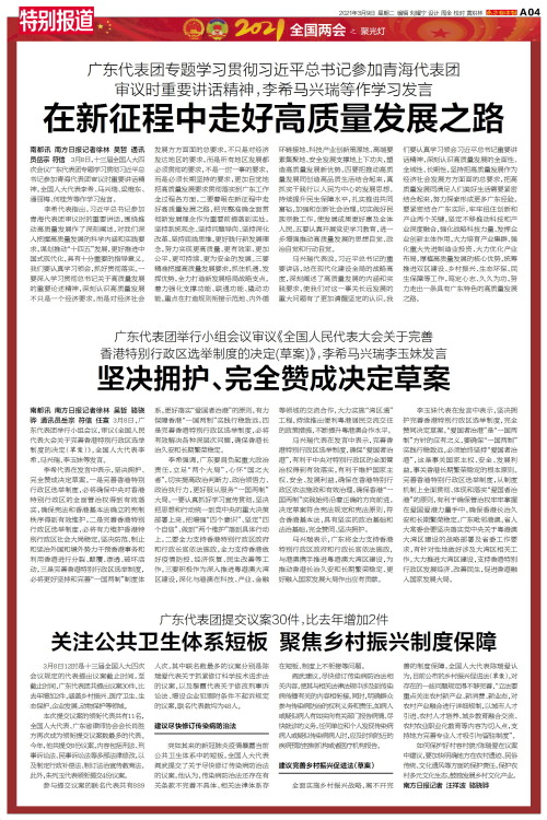 南都讯 南方日报记者徐林 吴哲 骆骁骅 通讯员岳宗 符信 任宣 3月8日,广东代表团举行小组会议,审议《全国人民代表大会关于完善香港特别行政区选举制度的决定(草案)》,全国人大代表李希、马兴瑞、李玉妹