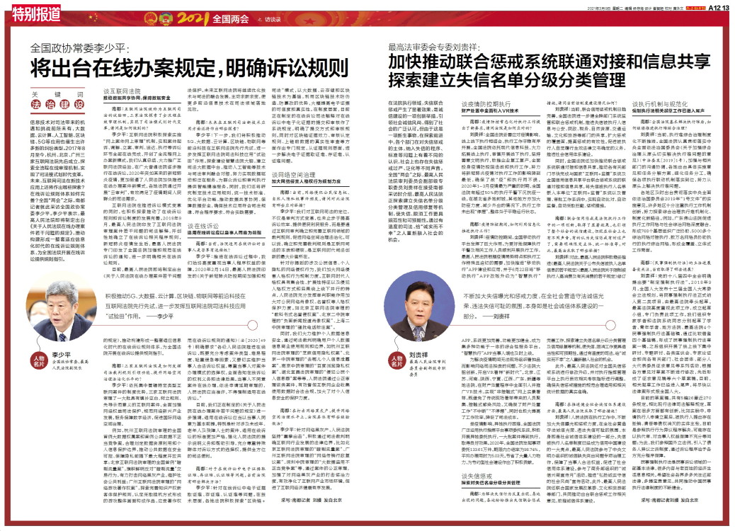 关键词 法治建设 人物名片 李少平 全国政协常委、最高人民法院副院长 积极推动5G、大数据、云计算、区块链、物联网等前沿科