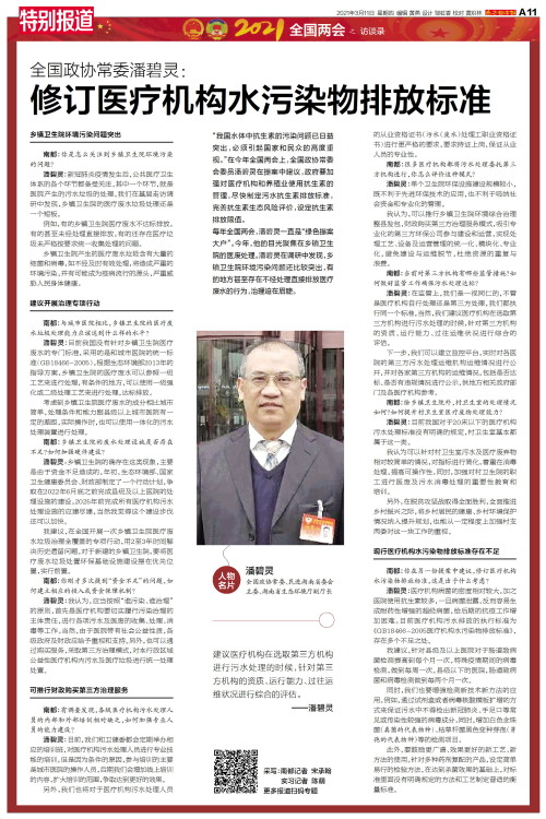 全国两会之访谈录 人物名片潘碧灵全国政协常委、民进湖南省委会主委、湖南省生态环境厅副厅长建议医疗机构在选取第三方机构进行污水处理的时候,针对第三方机构的资质、运行能力、过往运维状况进行综合的评估