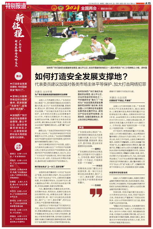 加快把广东打造成为全国最安全稳定、最公平公正、法治环境最好的地区之一。图为市民在广州二沙岛绿地上小憩。 资料图 要点 打造安全发展支撑地,守好国家安全“南大门”