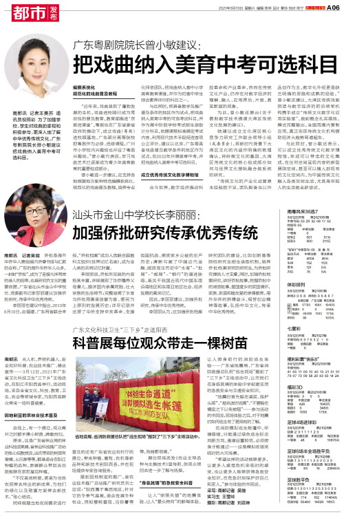 南都讯 记者王美苏 通讯员祝燕彩 为了加强学校、学生对戏曲的重视和积极参与,更深入地了解中华优秀传统文化,广东粤剧院院长曾小敏建议把戏曲纳入美育中考可选科目。编撰系统化规范化的戏曲普及教程“近年来,戏