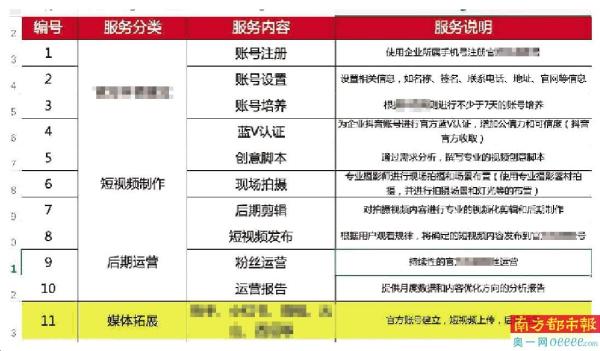 南都记者发现,这类公司以小微企业为主,有的以短视频制作“招揽业务”,有的是专业的广告公司。位于北京的一家短视频营销公司发来的服务详情表格中,涉及到的服务包括账号建立、短视频制作、后期运营、媒体拓展。在短视频制作一栏中,服务内容包括撰写脚本、现场拍摄、后期剪辑,后期运营有短视频发布、粉丝运营等内容。
