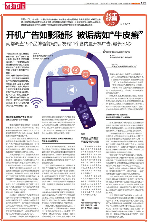 开机广告 [编者按] 昨日是3·15国际消费者权益日,南都推出系列专题报道,聚焦民生短板,破解民生难题,关注同老百姓最密切的民生话题,希望帮助消费者纾困解难,并发布消费安