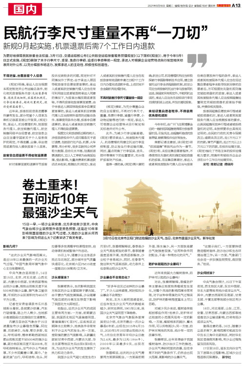 为更好地保障民航旅客合法权益,3月15日,交通运输部公布《公共航空运输旅客服务管理规定》(以下简称《规定》),将于今年9月1日正式实施。《规定》删除了关于行李尺寸、重量、免费行李额、逾重行李费等统一规