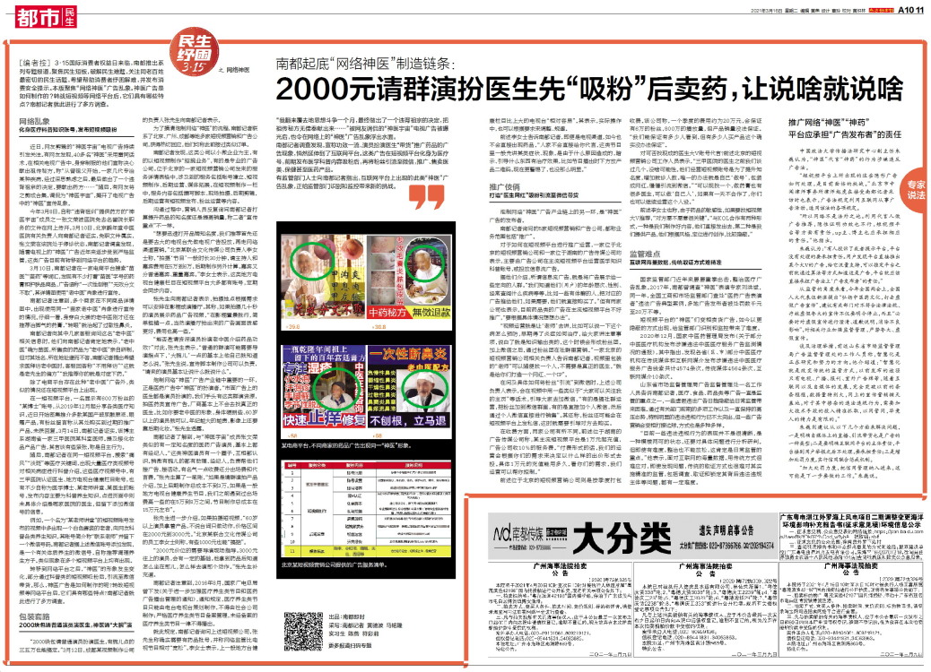 网络神医[编者按] 3·15国际消费者权益日来临,南都推出系列专题报道,聚焦民生短板,破解民生难题,关注同老百姓最密切的民生话题,希望帮助消费者纾困解难,并发布消费安全提示。本版聚焦“网络神医”广