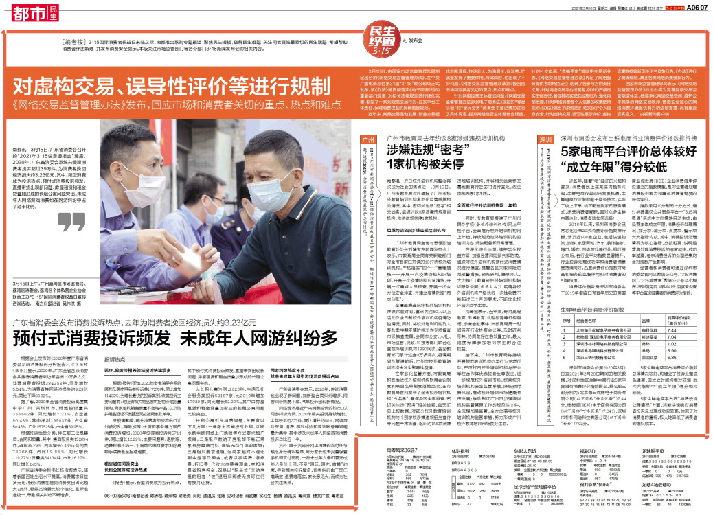 广州15日,广州市新闻办举行“3·15”国际消费者权益日“守护安全 畅通消费”专场新闻发布会,邀请6部门等有关负责人围绕“守护安全 畅通消费”主题,通报2020年全市消费者权益保护工作情况。南都讯