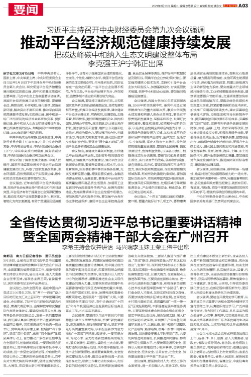 新华社北京3月15日电 中共中央总书记、国家主席、中央军委主席、中央财经委员会主任习近平3月15日下午主持召开中央财经委员会第九次会议,研究促进平台经济健康发展问题和实现碳达峰、碳中和的基本思路和主要