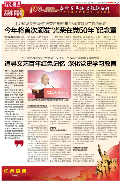 南都讯 记者王美苏 中国共产党成立百年来,广东文艺家响应时代召唤,始终与时代同行、与人民同心,贡献了一大批传世精品。在致敬经典作品的基础上,广东艺术如何在下一个奋斗历程中再创辉煌?昨日,“文艺之美 党