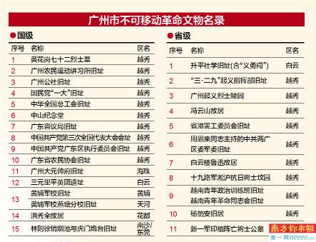 广州市高度重视红色革命遗址保护利用工作,认真落实中央《关于实施革命文物保护利用工程(2018—2022年)的意见》精神,组织开展革命文物名录核定公布工作。此次公布的214处不可移动革命文物和8812件/套可移动革命文物,包括15处全国重点文物保护单位革命文物、11处广东省文物保护单位革命文物以及69处广州市文物保护单位革命文物。三分之一的不可移动革命文物集中在越秀区,其他均匀分布全市各区。