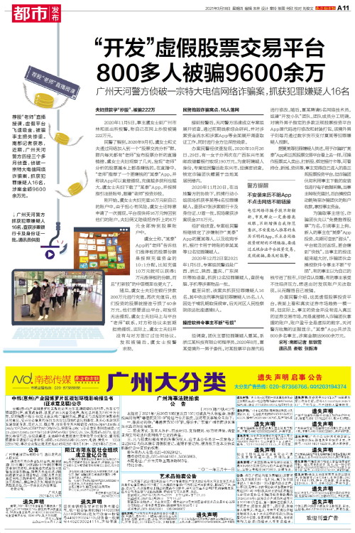 荐股“老师”直播授课,虚假平台飞速吸金,被骗事主损失惨重。南都记者获悉,近期,广州天河警方历经三个多月侦查,侦破一宗特大电信网络诈骗案,抓获犯罪嫌疑人16名,涉案金额9600余万元。夫妇贷款学“炒股”