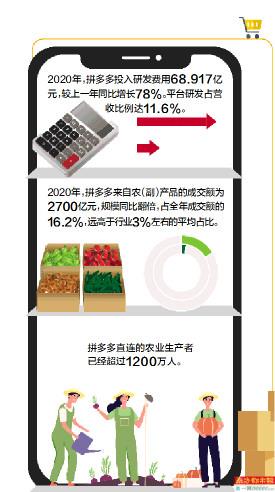 最新的财报数据显示,2020年,拼多多投入研发费用68.917亿元,较上一年同比增长78%。平台研发占营收比例达11.6%。持续投入之下,农产品及农副产品成为平台增长最快的品类。2020年,拼多多来自农(副)产品的成交额为2700亿元,规模同比翻倍,占全年成交额的16.2%,远高于行业3%左右的平均占比。